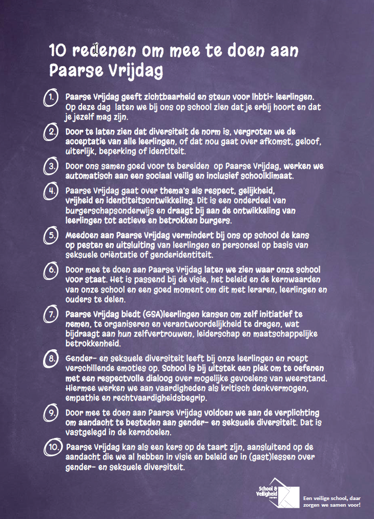 Bekijk de 10 reden om mee te doen aan Paarse Vrijdag! Het printable postertje maakt het handig om in gesprek te gaan in het team en met de schoolleiding, als er nog twijfels zijn over meedoen bijvoorbeeld. Of om te communiceren met ouders (en leerlingen) over waarom jullie meedoen aan Paarse Vrijdag. Klik op de afbeelding om te downloaden.